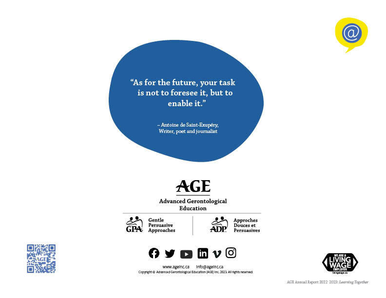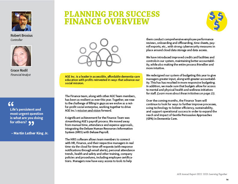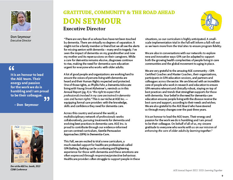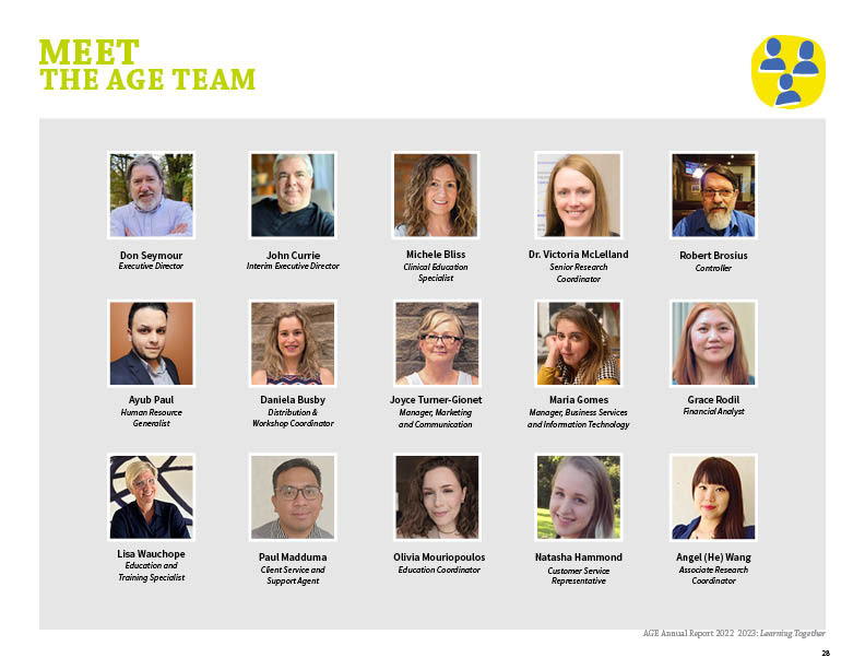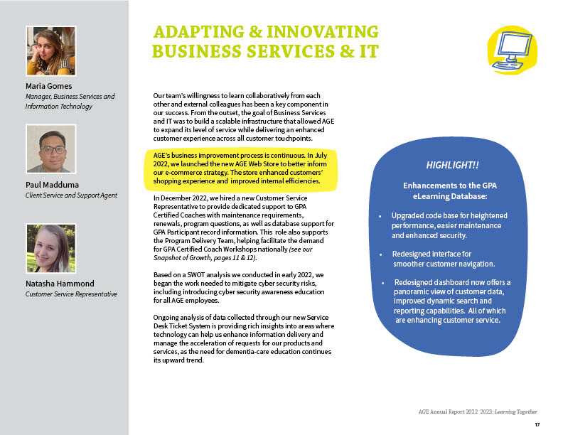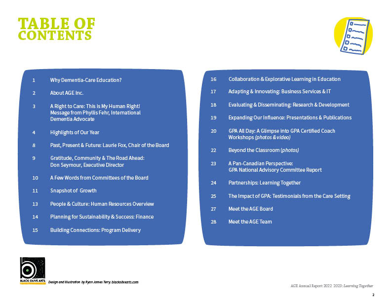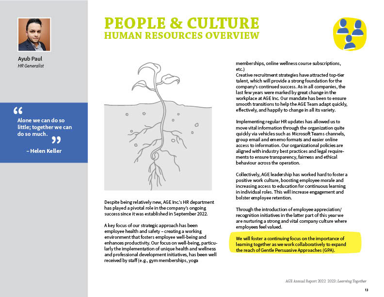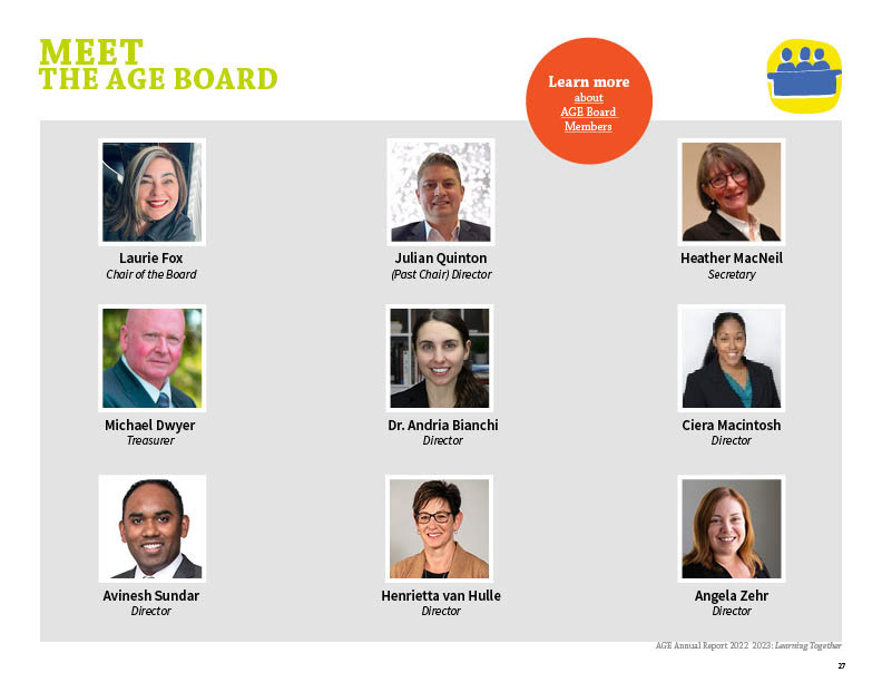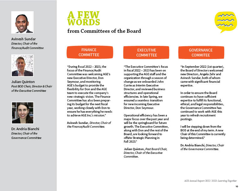 2023 Board report for AGE Inc. We discussed a colourful, more playful report as opposed to something more traditional and static. The completed document is still corporate and professional, but has a nice loose energy.